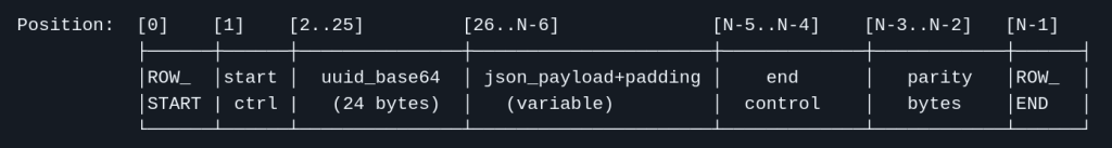 Next we now have padding. We want to make sure that each row is fixed size. So far, the begin action, the uuid, and the after_action are all the same size. Only the data payload is potentially variable, so we’ll add padding bytes to reach the fixed size.