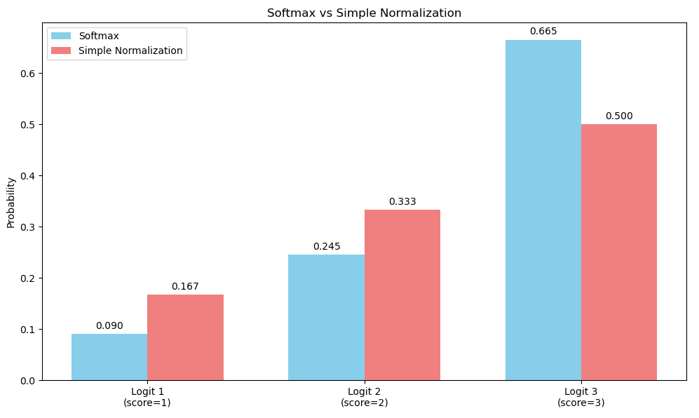A graph showing the differences in probabilities between a softmax weighted distribution, as opposed to an unweighted.The softmax table has probabilities .09, .245, .665The simple normalization bars have values .166, .33, and .5