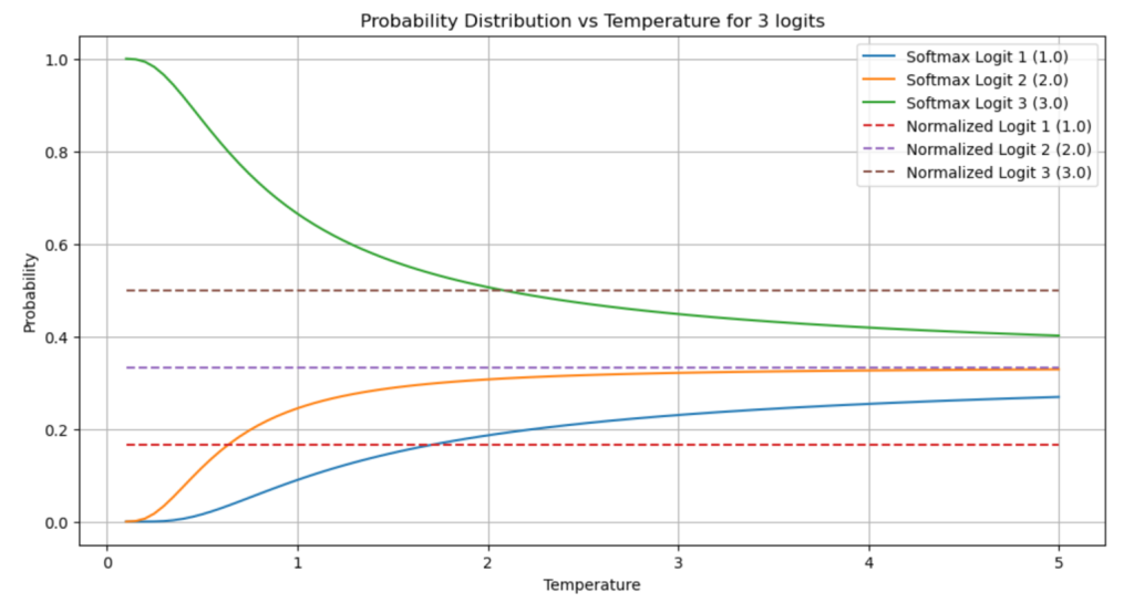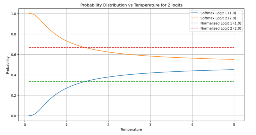 A graph showing the x axis of temperature, and the y axis of probability for two logits (of values 1 and 2). At the left end of the graph, the values are 100% for the #2 logit, and at the right end of the graph, they very very slowly start to converge to 50%